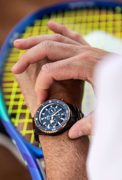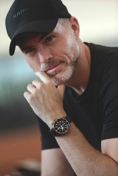 Para marcar esta alianza, Hayser luce el impresionante Rado Captain Cook High-Tech Ceramic Chronograph, una pieza que no solo da la hora: marca una actitud.